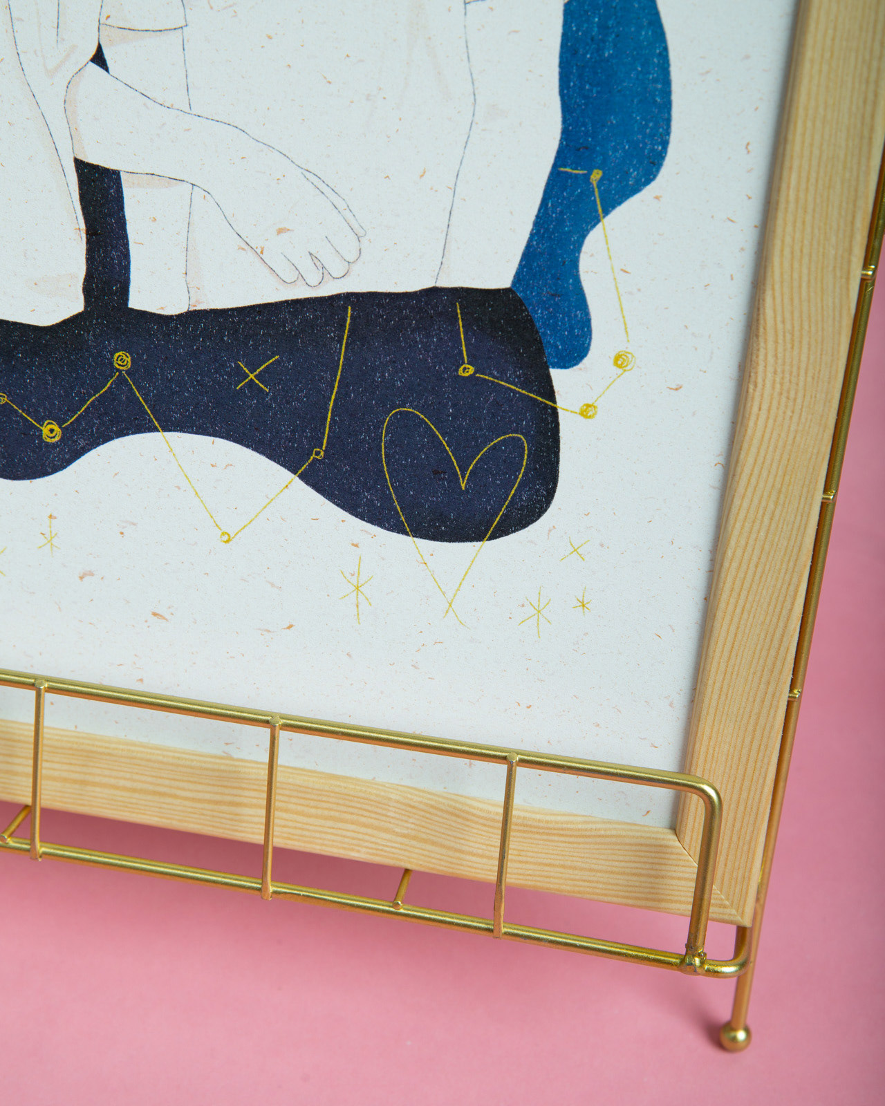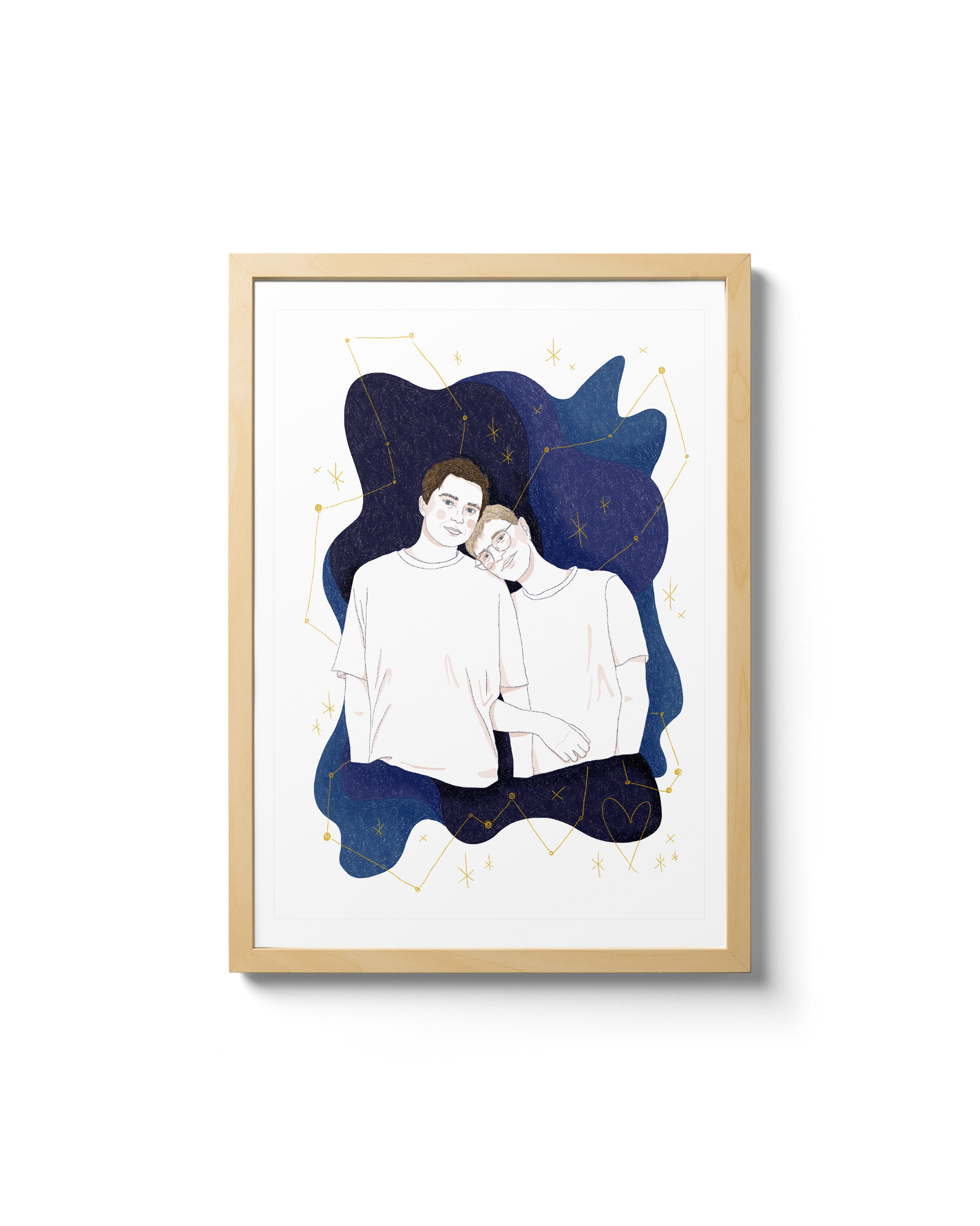 Wasz absolutny numer 1! I ja się nie dziwię, ciężko o bardziej romantyczny motyw, niż prywatna konstelacja 😊 Sam portret jest w tym przypadku linearnym rysunkiem, z jedynie delikatnie zaznaczonymi cieniami, dzięki czemu świetnie kontrastuje z ciemnym, nocnym niebem w tle. Portret drukowany jest na papierze Keykolour Recycled Gold, w którym zatopione są złociste drobinki, pięknie mieniące się w świetle.